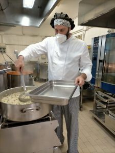 “La cucina è strutturata in modo semplice: c’è un capo cuoco che organizza il lavoro di tutti e cucina i piatti, un cuoco che aiuta nella preparazione delle pietanze, un addetto mensa che impiatta i cibi freddi che non hanno bisogno di cottura e serve gli ospiti che riescono a spostarsi nella sala comune a mangiare e i gli addetti al lavaggio che tengono la cucina pulita e lavano le stoviglie a fine servizio. Ci sono molte esigenze diverse, dai pasti per le persone diabetiche, agli omogeneizzati per coloro che non riescono a masticare il cibo fino alle diete specifiche per alcuni ospiti”.